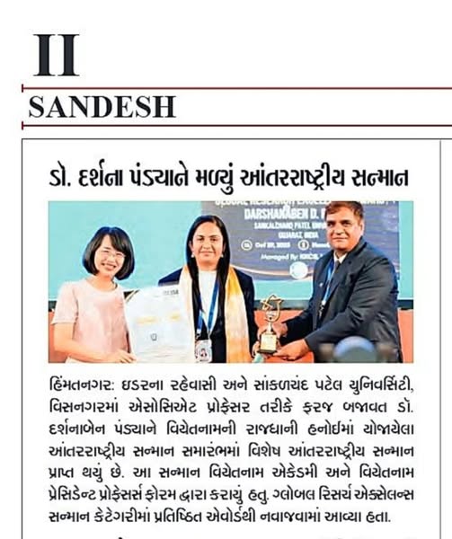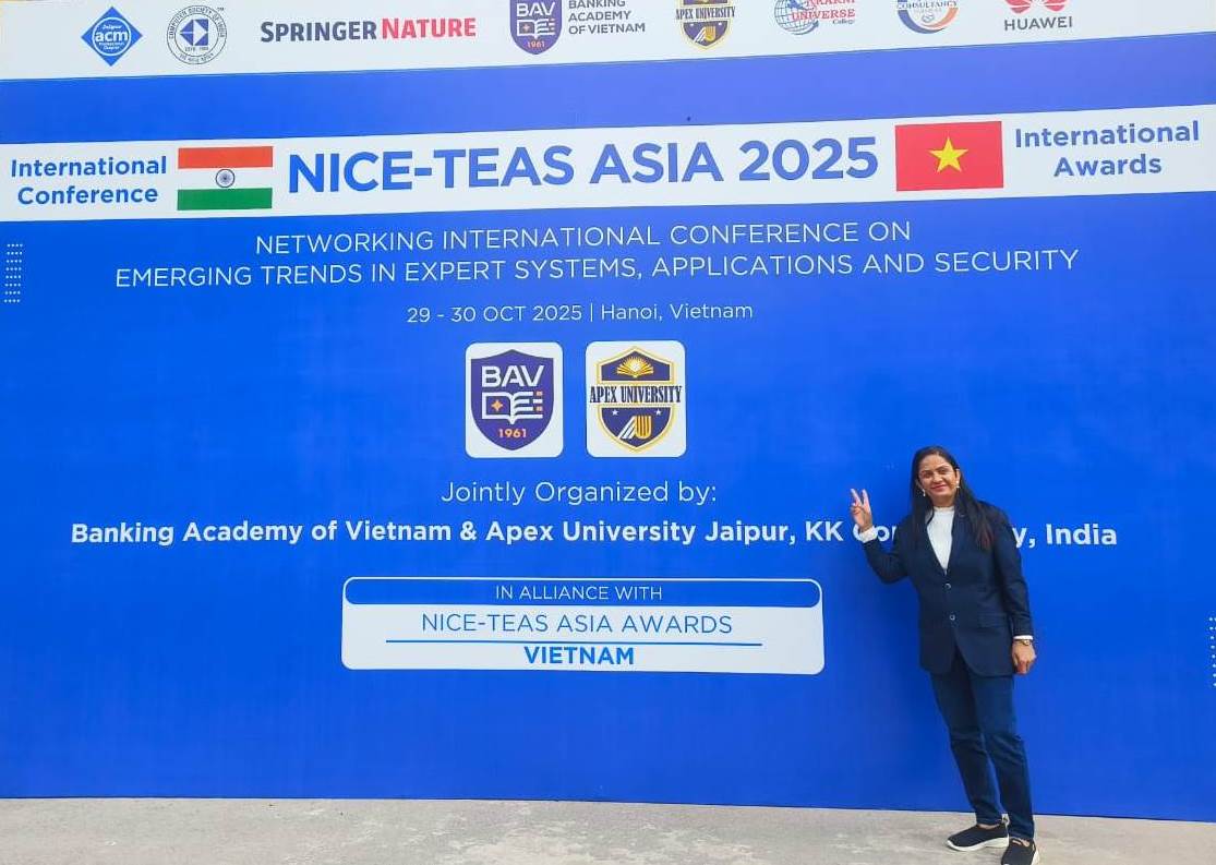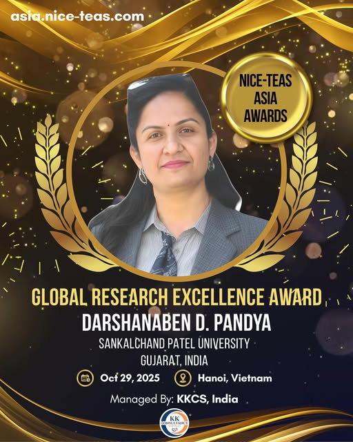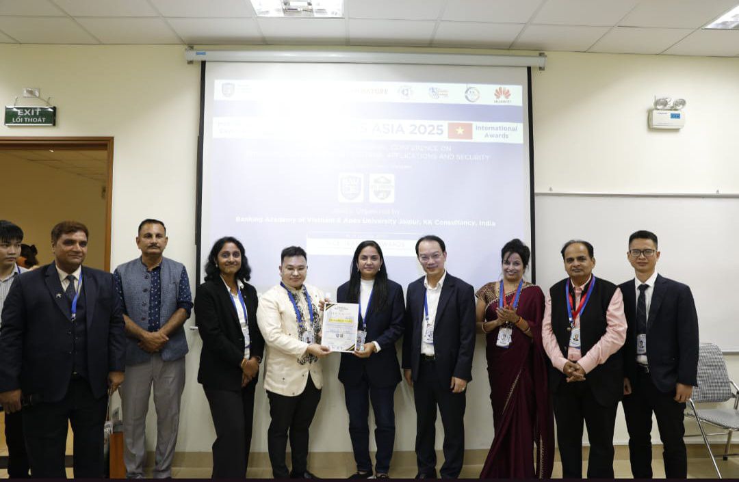 Dr. Darshana Pandya received the "Global Research Excellence Award"On 29–30 October 2025, the prestigious NICE-TEAS ASIA 2025 International Conference was held at the Banking Academy of Vietnam (BAV), Hanoi in collaboration with Apex University, India.