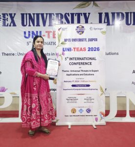 Dr. Darshana Pandya received the Global Research Excellence Award and served as a Session Chair at the Springer International Conference on Universal Threats in Expert Applications and Solutions (UNI-TEAS 2026), jointly organized by Shree Karni Universe College and Apex University, India.