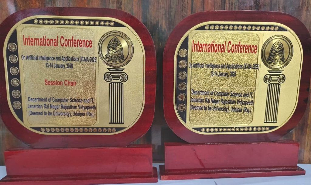 Dr. Darshana Pandya invited as a Session Chair at the International Conference on Artificial Intelligence & Applications (ICAA–2026), organized by the Department of Computer Science & IT, Janardan Rai Nagar Rajasthan Vidyapeeth (Deemed to be University), Udaipur, held on 13–14 January 2026